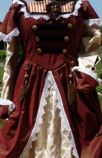 - Robe manteau en tissu de type soie marron – grenat, imprimé doré avec dentelle, galons et boutons militaires, jabot rayé et accessoires fourrure